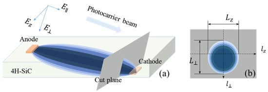 Here, J n is defined as current in unit area per unit time, expressed as J n = J n σ , t . Similarly, E , n , p is, respectively, the gradient of E σ , t , n σ , t , p σ , t . μ n , D n is the mobility and diffusion coefficient of electrons, while μ p , D p is the same for holes. As seen in Figure 2, imbalanced photocarriers transport along the electric field lines between anodes and cathodes [6], integrating into a rugby ball-like beam. Moreover, this is assuming only electrons are generated and participate in Drift–Diffusion motion.