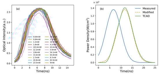 Figure 3. (a) Measured light signals; (b) the blue solid line is the averagely fitted curve by Equation (7); the orange dashed line, called modified light signal, comes from the blue line shifted by 5 ns along x axis, which is the rise delay of independent voltage source in Figure 5a; the green solid line represents an illumination signal in TCAD with adapting parameters of a piecewise gaussian function, as Equation (8), to the modified light signal.