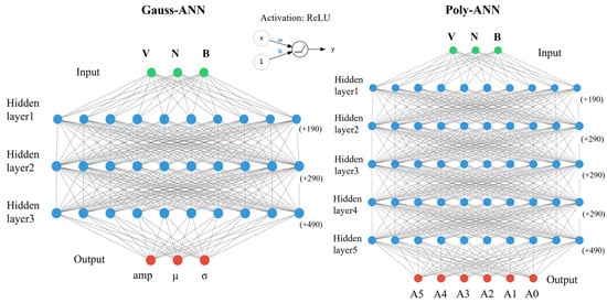 In Equation (9), amp, μ and σ are, respectively, the amplitude, mean and standard deviation of a common gaussian function. In Equation (10), A5, A4, A3, A2, A1, A0 in turn mean the power of exponential items from degree 5 to 0 of variable t. Then, two types of models can be created based on these two fitting functions, named Gauss-ANN and Poly-ANN, depicted in Figure 4. The three-dimensional input array consists of doping concentration, while output is determined by the specific equation. Hidden layers of two architectures have been shown, but the neuron numbers are too big to be fully displayed. Both of the two models are made up of input layers with 200 neurons and output layers with 500 neurons. Gauss-ANN has three hidden layers while Poly-ANN has five, and the neuron number of each is 300, which will be further discussed later. The activation function is Rectified Linear Unit (ReLU), expressed as m a x ( 0 , w T x + b ) . For linear functions, ReLU is more expressive, especially in deep networks; For nonlinear functions, ReLU does not have a vanishing gradient problem because the gradient of the non-negative interval is constant, so the convergence rate of the model is maintained in a stable state.