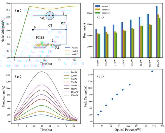 Figure 5. Mixed-Mode simulated (a) node voltage in circuit configuration, (b) runtime cost of three types of devices, (c) transient photocurrent, and (d) peak currents of ET-PCSS with opposed electrodes under various triggering optical powers.