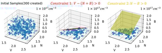 Also worth mentioning is the particularity in LHS processing. That is, the simulation solver could be non-convergent, or the doping concentration of samples may violate the fact in some cases. As a summary, it can be concluded as two constraints among three variables. One is when vanadium concentration (represented by V) is smaller than the sum of the concentration of nitrogen (represented by N) and boron (represented by B), 4H-SiC substrate of PCSSs will lose the characteristic of semi-insulating, leading to a large deviation from measurement. Another, if N is less than B, the simulation solver will not reach convergence, possibly as a result of the net doping of electrons being smaller than zero. Herein, a constrained LHS is implemented with two constraints for higher feasibility of sampling. Details can be seen in Figure 6. The whole flow is divided into three steps. First is a regular LHS based on the range of variables, after which 300 samples are created. The second step is partitioning the 3D space with a red plane formulated by the constraint 1 V N + B > 0 . The third is similar to step 2, with a yellow plane formulated by the constraint 2 N B > 0 . Finally, 108 filtered samples were ready for simulation and model training.