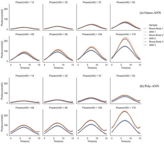 As shown in LHS processing, both constraints take the doping concentration as a three-dimensional input of ANN, while the predicting ends are parameters of in fitting equations for two models. This means the whole monopulsed transient characteristics of an ET-PCSS can be described as long as all the parameters are forecasted by trained ANN predictors. In Figure 7, photocurrents–time response curves under various triggering powers of the three ET-PCSSs in Table 1 are presented. Here, we compare the transient currents of three devices calculated from Mixed-Mode and ANN models (Gauss-ANN shown in Figure 7a and Poly-ANN shown in Figure 7b). From the perspective of forecast accuracy, mean absolute error (MAE) of sample 1, for example, under various triggering powers is successively 2.0 A, 3.1 A, 5.4 A, 8.8 A, 12.1 A, 16.4 A, 22.4 A, and 47.2 A in the Gauss-ANN predictor, while being 1.4 A, 2.6 A, 5.7 A, 10.3 A, 14.5 A, 19.8 A, 27.3 A, and 56.1 A in the Poly-ANN predictor. At low powers such as 14 mW, 22 mW, 37 mW, and 55 mW, the predicting outcomes are more believable for MAE of photocurrent less than 10 A. The higher the triggering power is, the more deviation in transient photocurrent there is. Wei et al. [16] investigated the switching transient of GaAs PCSS undergoing the transition from a linear mode to a nonlinear mode, based on a “two-channel” model. Simulations and experiments reached an agreement on the formation and evolution of multiple avalanche domains by comparing the output waveforms under different triggering energies, which verifies the effectiveness of the proposed physical model. This “two-channel” model is a kind of physics-based model that belongs to GaAs PCSSs with linear and nonlinear modes at the same time. In a similar way, our work built a transient model for ET-PCSS in its only linear mode, preparing for a physics-based ANN architecture. Both simulations and experiments revealed a great degree of fitting for transient curves of ET-PCSSs. What is worth mentioning is that in quintic polynomial fitting based Poly-ANN predictors, loss of robustness is due to the complexity of polynomial coefficients, compared with gauss fitting. Therefore, a curl of tail the in photocurrent-time curve can be found in the Poly-ANN model, especially under higher powers, but there is little difference in peak current between the two models. In addition, total time cost in the Gauss-ANN and Poly-ANN model is 6.0 s and 4.5 s, including training and predicting, which is much lower than the several thousands of seconds for pure TCAD simulation.