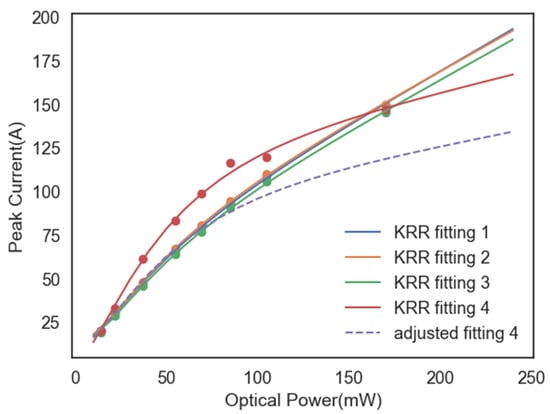 Figure 8. KRR fitting relationship between peak currents and optical powers of three samples from Gauss-ANN and one from experimental test. The dashed line stands for the relationship curve adjusted based on the lower optical powers of the experimental relationship, which can be applied for estimating higher optical powers in ANN models.