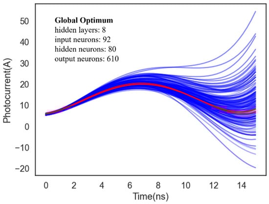 Initial architectures of Gauss-ANN and Poly-ANN models are configured with three input variables, input layers with 200 neurons, three hidden layers with 300 neurons and an output layer with 500 neurons. By comparation, the randomness in model converging has a greater influence on the latter, which mainly falls in the tail of the curve of photocurrent-time curves as mentioned previously. In order to weaken this phenomenon, Bayesian optimization (BO) is implemented for the objective of minimizing the deviation of the tail of curve. BO algorithm has certain advantages, especially for high-overhead black-box function optimization (such as machine learning model tuning). It enables efficient and accurate global optimization by selecting the next sampling point based on the confidence of existing data and model construction. The process of optimizing is given in Table 3. As can be seen in Figure 9, 100 iterations of transient curves from the Poly-ANN predictor are depicted with blue lines. Then, the red line among them is just the optimum for its smallest deviation from the actual transient photocurrent. This optimized model consists of eight hidden layers and 92 neurons of input layers, 80 neurons of hidden layers, and 610 neurons of output layers. Compared with the initial architecture, the depth of the ANN has increased, adding some nonlinearity between inputs and outputs. Nevertheless, more neurons of the output layer may enlarge the complexity and reduce the generalization ability, or even raise the time cost of ANN predictor.