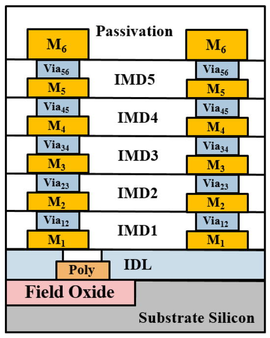 A standard 0.18 μm CMOS process offers one poly layer and six metal layers, as shown in Figure 2. The thickness of the top metal layer (M6) is 2.34 μm, and the thickness of other metal layers (M1~5) are all 0.53 μm. Typically, the M1 layer is also known as the bottom metal layer. Each layer of metal can be connected by Via layers. Except for the thickness of Via56, which is 1 μm, the thicknesses of the other Via layers are 0.85 μm. The poly layer is for the transistor’s gate and thus is above the substrate. The M1 and poly layers are separated by a 0.75 μm thick SiO2. The dielectric constant of the passivation layer and IMD1-5 layers are about 7.5 and 4, respectively. Due to the multi-layer technology, the CMOS process has a high degree of flexibility in designing different transmission lines. The most widely used transmission lines include thin-film microstrip lines (TFMSL) [17], coplanar waveguides (CPW) [18], and conductor-backed coplanar waveguides (CBCPW) [19]. Typically, thin-film microstrip lines (TFMSL) adopt the thick top metal layer (M6) as a signal trance for minimize conductor losses, and they use one of the other metal layers as a ground plane, as shown in Figure 3a. The biggest advantage of TFMSL is that it is suitable for circuit miniaturization. However, compared to other traditional transmission lines, it cannot withstand higher power transmission and has higher loss [20].
