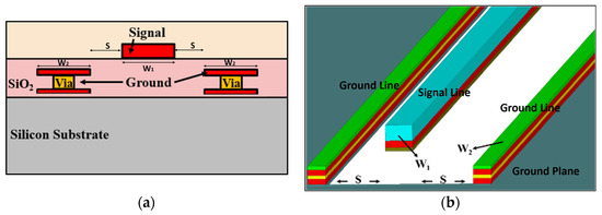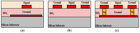 Figure 3b depicts the structure of the coplanar waveguide (CPW). The CPW is to place a signal trace at the center of two ground planes, so that two tiny narrow gaps are formed between the metal strip line and the ground planes [18]. The CPW is featured as its single metal formation, and the advantage of CPW is that the metal signal line in the middle is very close to the ground planes on both sides, so CPW is particularly easy to use when designing active circuits. In addition, the electrical characteristics of CPW are less affected by the thickness of the dielectrics. The characteristic impedance is determined by the width of the two sets of narrow gaps and the width of the metal strip line in the middle. Therefore, the achievable range of the characteristic impedance is relatively large compared to the TFMSL. The conductor-backed coplanar waveguide (CBCPW) is a derivative structure of the coplanar waveguide [19]. The difference is that CBCPW adds a ground plane on the substrate, as shown in Figure 3c. In addition to maintaining the advantages of CPW, CBCPW has a third ground conductor, so it has a better heat dissipation effect. However, because of this architecture, it is not easy to implement a transmission line with high characteristic impedance.