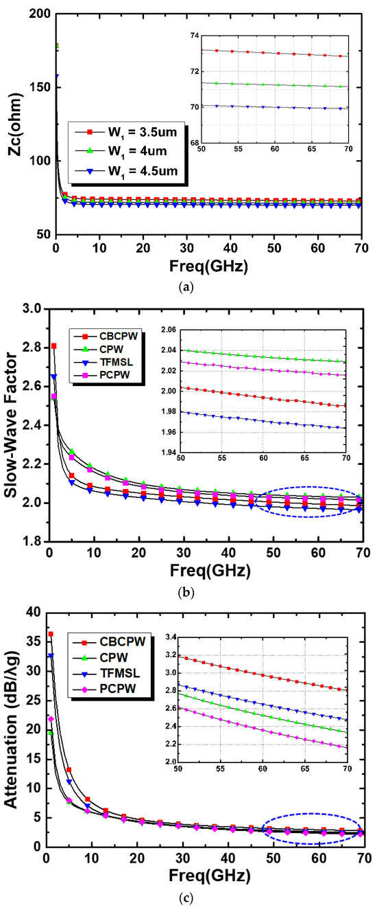 Figure 5. (a) Simulated Zc of the PCPW structure. Simulated (b) slow-wave factor (SWF) and (c) attenuation results of 70.7-Ω CBCPW, CPW, TFMSL, and PCPW structures.