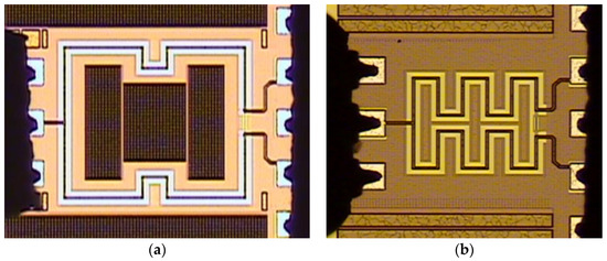 There were two multi-layered PCPW Wilkinson power divider designs used in this paper for further comparison. The two WPDs were based on the same PCPW structure parameters in terms of line width, spacing, and used metal layers. One was straight PCPW-based WPD, and the other was meandered PCPW-based WPD. Both the two 60 GHz WPDs were designed and fabricated in a standard mixed-signal/RF bulk 0.18 μm CMOS process provided by the Taiwan Semiconductor Manufacturing Company (TSMC), Hsinchu, Taiwan The process provides a single poly layer and six metal layers (1P6M) for interconnections. The relative dielectric constants of intermedia-dielectric layers (SiO2) and silicon substrate were about 4 and 11.9, respectively. Moreover, the top metal layer (M6) had a thickness of 2.34 μm, and the other metal layers (M1~M5) were 0.53-μm. All metal layers were made of AlCu. Figure 6 shows the chip photo of the two WPDs using straight- and meandered-layout PCPW structures. The chip sizes excluding all testing pads of the straight-layout and meandered-layout WPDs were 0.625 mm × 0.6 mm and 0.2 mm × 0.23 mm, respectively. Both layouts were symmetrical, and there were some dummy metal fills placed inside and outside the two layouts to meet the design rules required by the foundry for metal planarization, as shown in Figure 6.