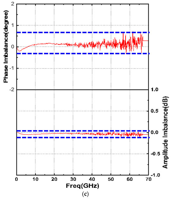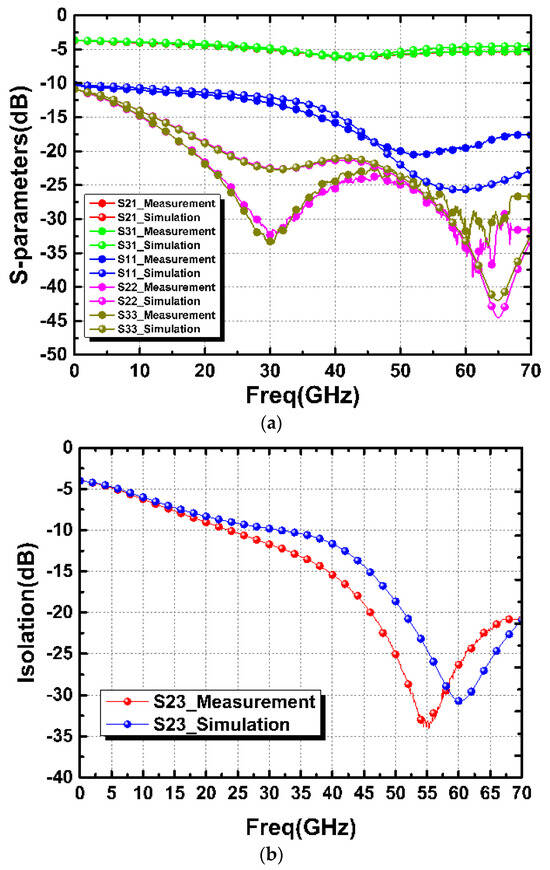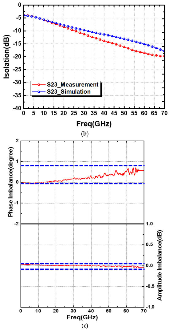 Figure 7 shows the simulated and measured results of the straight-based PCPW WPD. The measured |S21|, |S31|, |S11|, |S22|, and |S33| at 60 GHz were 5.39 dB, 5.32 dB, −19.56 dB, −31.6 dB, and −34.3 dB, respectively, as shown in Figure 7a. The measured |S23| (isolation) was 26.3 dB. Furthermore, the amplitude and phase imbalance were calculated from Figure 7a to be less than 0.1 dB and 0.7°, respectively. Similarly, the meandered design demonstrated that the measured |S21| and |S31| were about 5.1 dB, as shown in Figure 8a. All of the return losses were better than 17.5 dB at 60 GHz. Moreover, the measure isolation, amplitude imbalance, and phase imbalance were 18.5 dB, 0.03 dB, and 0.4°, respectively, as shown in Figure 8b,c.