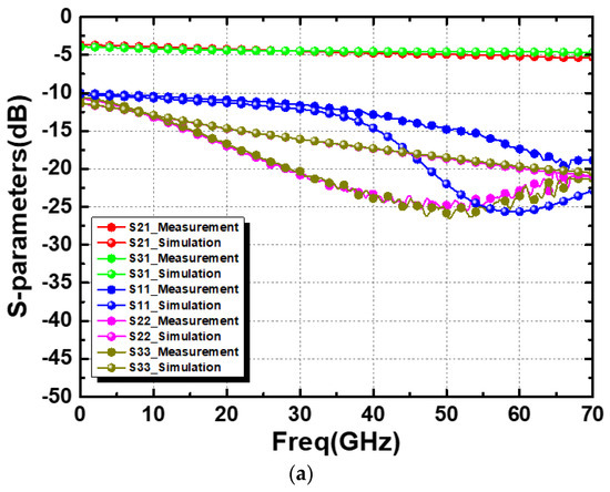 On-wafer measurements with the network analyzer (Keysight N5247A) were conducted to characterize the S-parameters of the two WPDs from 10 MHz to 67 GHz. All measured results were calibrated to eliminate the undesired parasitics of the testing pads. One ground–signal–ground CascadeTM (GSG) RF probe was used on the left-hand side and one CascadeTM GSGSG RF probe was used on the right-hand side, as shown in Figure 6. The two prototype designs were tested for more than three samples. For the measured insertion losses (|S21| or |S31|) and the measured center frequency of the designs, the sample-to-sample variations were less than 0.1 dB and 0.4 GHz, respectively. The following experimental results show the average data among the measured samples.