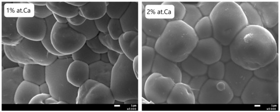 The bulk density determined by Archimedes’ method is equal to 6925 and 6954 [kg/m3], respectively, for 1 at.% and 2 at.% of calcium dopant. These values are higher compared to the density of undoped PBZT 25/70/30 ceramics, which is equal to 6800 [kg/m3] [35].