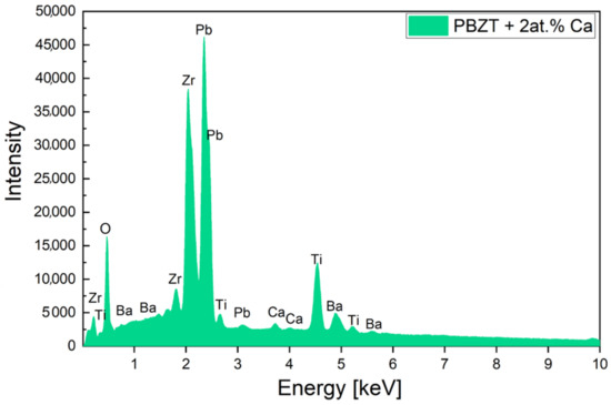 The ceramic materials were subjected to energy-dispersive X-ray (EDS) analysis. Figure 2 displays an exemplary EDS spectrum for the PBZT ceramics modified by 2 at.% of Ca. The results confirmed the absence of any extraneous elements or impurities.