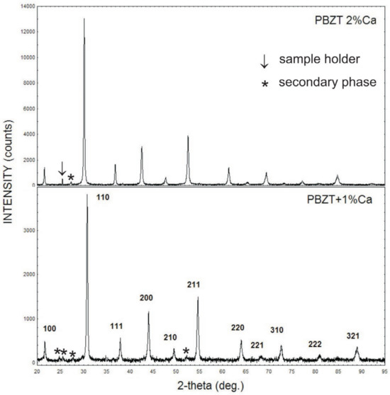 The main peaks of diffractograms were indexed according to a rhombohedral, perovskite-like ABO3 structure of space group R3c. This agrees well with the data reported earlier by Mir et al. [36]. However, the departure of the lattice from cubic symmetry is very little. The parameters of the unit cell are equal a = 4.1140 (4) (Å), = 89.969 [deg] for ceramics with an admixture of 1 at.% of calcium and a = 4.1115 (1) (Å), α = 89.968 [deg] for ceramics with 2 at.% of Ca, respectively. The lattice parameters are slightly smaller compared to those for a pure PBZT 25/70/30 material, which is a result of differences in the size of the ionic radius of lead, barium, and calcium. Moreover, the small admixture of Ca significantly enhanced the piezoelectric d31 coefficient, as is shown in Section 3.4. Thus, it can be claimed that Ca ions were incorporated into the rhombohedral lattice of PBZT. A tiny amount of secondary phase/phases was detected (peaks marked by a star in Figure 3). In fact, it is impossible to identify the phase the peaks come from, as their signal is close to the XRD detection limit. In the case of the sample with an admixture of 2 at.% of Ca, a weak signal from the sample holder can also be seen. This is evidenced by the narrow peak close to 25.5 [deg].