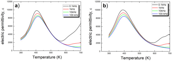 The measurement of the temperature dependence of electrical permittivity and the tangent of the loss angle was conducted during the heating process in the temperature range from room temperature to 700 K. The characteristics obtained at four different measurement field frequencies are presented in Figure 4 for both discussed materials.