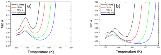 The temperature dependencies of the loss factor (tanδ) of both discussed ceramics are presented in Figure 5.