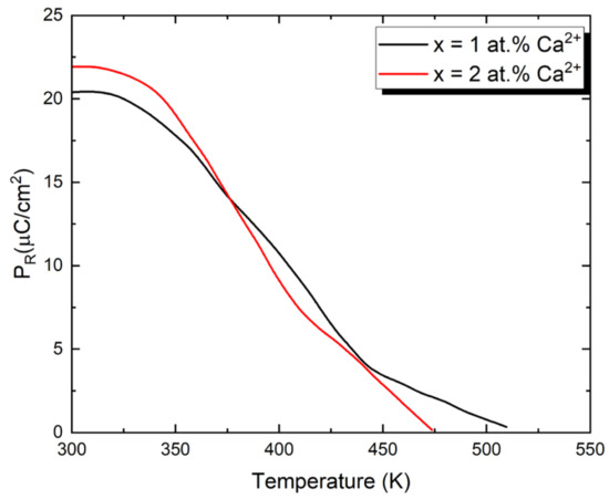 The remanent polarization of calcium ions modified PBZT 25/70/30 ceramics as a function of temperature, obtained from hysteresis loop measurements.