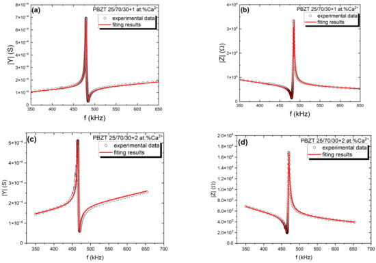 In aiming to obtain the d31 piezoelectric coefficient, the modulus admittance |Y| and phase angle θ were measured in the function of frequency. The experimental results allowed us to determine the frequency dependencies of the impedance modulus |Z|. The frequency’s dependencies of both moduli for all modified ceramics are shown in Figure 7. The maximum and minimum of |Y(f)|correspond to the resonance fr and antiresonance fa frequency, respectively.