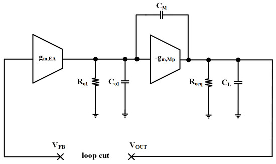 where and denote the transconductance of the error amplifier and the power transistor, respectively, and denote the equivalent output resistance of the error amplifier and the equivalent output resistance of the OCL-LDO, respectively, is the load capacitance, and is the gate parasitic capacitance of power-FET. In the absence of Miller compensation, the transfer function of the OCL-LDO loop displays two poles that are quite near each other in some cases. This closeness leads in a narrow phase margin, which may not fulfill the stability criteria for the system. To address this, the addition of a Miller compensation capacitor, , becomes necessary. The Miller compensation capacitor is used to generate isolation between the primary and secondary poles of the transfer function. By connecting the between the output of the error amplifier and the input of the power transistor, the output of the error amplifier is able to be fixed as the primary pole, which is reduced to a large extent compared to the initial error amplifier output pole, while the may successfully boost the size of the secondary pole, thus enlarging the phase margin. At this stage, the loop transfer function of the OCL-LDO may be stated as: