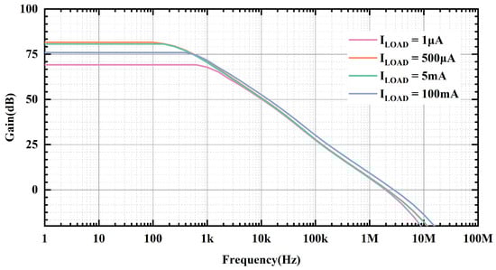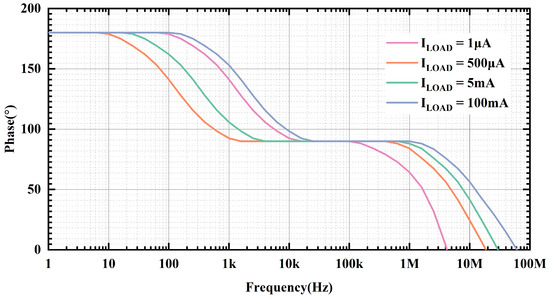 Figure 5 and Figure 6 provide the loop gain and phase simulation results at room temperature, input voltage of 1.2 V and output voltage of 1 V with different load currents, respectively. At ultra-low loads, its secondary poles are close to the main poles. As the load current increases, the output equivalent resistance decreases, so the secondary pole is far away from the main pole, and the phase margin becomes more favorable. Figure 7 presents the phase margin at different load currents when the load capacitance is 100 pF, and the variation trend of the PM is consistent with the previous analysis. The minimum phase margin (PM) is 42.5° when the load current is 1 A. And when the load current is greater than 25 mA, the power-FET begins to operate in the saturation region, at which time the transconductance of the power transistor is greater than the in the sub-threshold region, and the frequency where the secondary poles are located is greater than the GBW of the OCL-LDO; therefore, the phase margin is better during heavy loads.