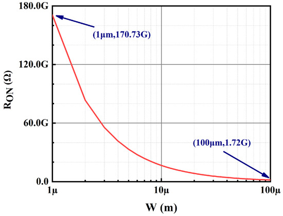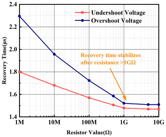 The simulation results of the recovery times corresponding to the overshoot and undershoot voltages of OCL-LDOs as a function of the resistor value are shown in Figure 13. It is observed from Figure 13 that the recovery time of the transient voltage remains basically stable when the resistance is larger than 1 G, that is, the variation in the transient voltage has no effect on the main loop. Because when the transistor width is 100 m, the of GSC PMOS is 1.72 G as shown in Figure 10, i.e., when the length of GSC PMOS is 200 nm, as long as the width of the transistor is less than 100 m, it enables the main loop to be unaffected by the transient voltage change.