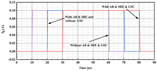 In addition to this, a sub-threshold CMOS-based slew-rate enhancement circuit is proposed to further improve the transient response of the OCL-LDO. – of the slew-rate enhancement are GSC MOSFET, which is employed to supply the bias voltage. The simulation results of versus the width for GSC PMOS with a length of 200 nm is given in Figure 10, where it is observed that the equivalent resistance of the GSC transistor is G-level. Take the low load to heavy load switching as an example; at this time, the output voltage results in the undershoot voltage, and the capacitor couples the same trend to the inputs of and in Figure 8, resulting in the drain voltage of and , i.e., the output voltage of the transient signal introduction stage increases, and the inputs of the slew-rate increasing branch sense through the capacitor the same change as the output of the previous stage, i.e., the gate voltages of and increase simultaneously, and at this time the gate voltage is discharged to make the output voltage reach stability quickly. An inverter-like structure is employed in this slew-rate enhancement circuit with a rail-to-rail output range, but its quiescent current is determined by the bias voltage, while its effect on loop stability has been analyzed above, and it has no impact on the primary and secondary poles of the feedback loop. The simulation conditions for switching load current within 500 ns are given in Figure 11 for an input voltage of 1.2 V and an output voltage of 1 V, and the simulation results shown in Figure 12 are obtained, which show that this sub-threshold slew-rate enhancement circuit could improve the transient response of the proposed OCL-LDO.