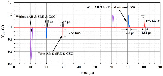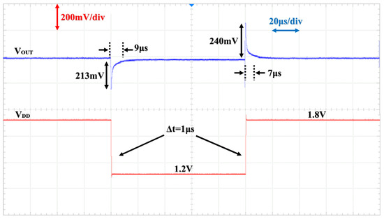 Figure 17 presents the load transient response of the OCL-LDO when the input voltage is 1.2 V and the output voltage is 1 V, where the load current switches between 100 A and 100 mA load current within 500 ns. As seen in the figure, the overshoot voltage is 197 mV, corresponding to a recovery time of 1.7 s. And when the load is changed from 100 A to 100 mA, the undershoot voltage is 201 mV, with a recovery time of 1.8 s. Compared with the simulation results in Figure 17, the overshoot and undershoot voltages of the measurement results are slightly increased, which is due to the parasitic capacitance at the output PAD.