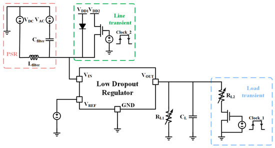 - Fan, H.; Feng, L.; Diao, X.; Xie, X.; Wang, C.; Li, G.; Wei, Q.; Qiao, F.; Feng, Q.; Bonizzoni, E. A Fast Transient LDO Regulator Featuring High PSRR Over 100-kHz Frequency Range with Adaptive, Dynamic Biasing, and Current Mode Feed-Forward Amplifier. IEEE Trans. Circuits Syst. II Express Briefs 2024, 71, 1764–1768. [Google Scholar] [CrossRef]