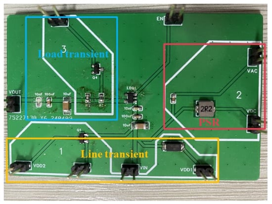 The ultra-low quiescent current OCL-LDO with the sub-threshold slew-rate enhancement circuit proposed in this paper is fabricated in a TSMC 0.18 m process. The chip micrograph is shown in Figure 14, with an active area of 0.049 mm2 (228 m × 215 m). The dropout of this OCL-LDO is 200 mV, i.e., when the output is 1 V, the minimum input voltage is 1.2 V, at which point the OCL-LDO is capable of driving a load current range of 1 A–100 mA. The minimum quiescent current is only 640 nA, and because of the adaptive biasing scheme, the quiescent current range of this OCL-LDO is 0.64–61.2 A. The test circuit schematic of this OCL-LDO is given in Figure 15, and Figure 16 is the PCB test board corresponding to the test circuit schematic.