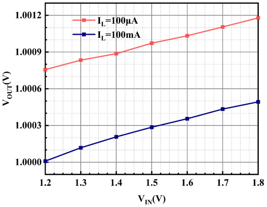 The low dropout regulator is a circuit structure that is capable of delivering a stable voltage value that has no significant deviation with the input voltage variation. In order to feature the effect of input voltage variation on the output voltage, the line regulation is proposed; Figure 19 shows the measurement results of the OCL-LDO proposed in this paper for the variation in the output voltage with the input voltage under different load currents, and its line regulation is 0.7 mV/V and 0.87 mV/V for load currents of 100 A and 100 mA.