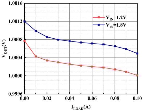 With similarity, the variation in the load current is also not supposed to make the output voltage generate large fluctuations. The experimental results of the load regulation of the OCL-LDO proposed in this paper are shown in Figure 20, which are 7.6 V/mA and 7.3 V/mA when the output voltage is 1 V, and when the input voltage is 1.2 V and 1.8 V, respectively.