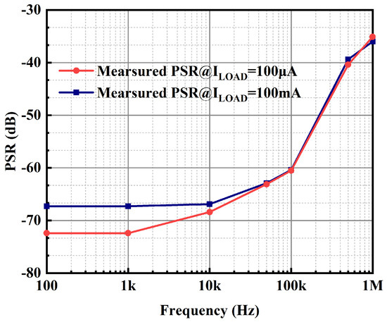 The OCL-LDO is required to have favorable ripple immunity to provide a stable voltage supply, so its PSR performance is also extremely important. The PSR test results of the OCL-LDO proposed in this paper are provided in Figure 21. Since the adaptive biasing scheme is included within the OCL-LDO proposed in this paper, the bias current of the error amplifier increases when the load current is high. The primary pole of the error amplifier increases, which also results in the PSR of the OCL-LDO having a larger zero at heavy loads than the corresponding zero at low loads [31]. The PSR at 1 KHz is −72.4 dB when the load current is 100 A.