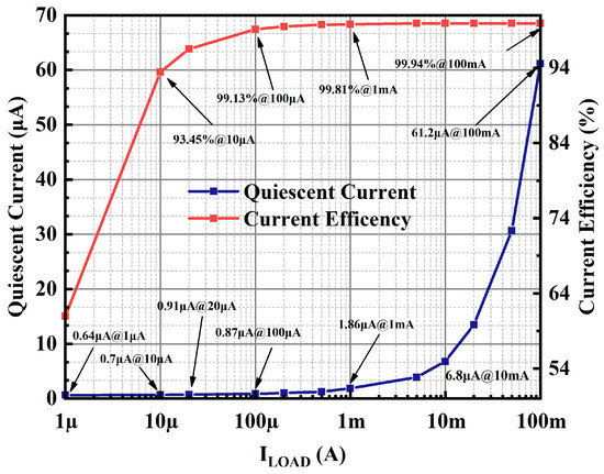The quiescent current of this OCL-LDO increases with the load currents because of the adaptive biasing scheme within the OCL-LDO proposed in this paper. Measurement of the quiescent current of the OCL-LDO is performed by utilizing the test circuit schematic shown in Figure 15, which requires the supply voltage that is 1.2 V to be provided by the , and the input voltage is 1 V. The load currents could be calculated according to the different load resistances, and the quiescent current of the OCL-LDO is obtained by subtracting the load current from the current flowing out of the power supply. The quiescent current of the OCL-LDO proposed in this paper varies from 0.64–61.2 A as shown in Figure 22. Meanwhile, the current efficiency characterizes the effective conversion rate of the OCL-LDO to the input signals, and the peak current efficiency of the OCL-LDO proposed in this paper is 99.94%.