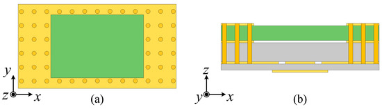 The configuration of the proposed wideband dual-beam SIDRA is shown in Figure 1, which consists of a patch-loaded perforated rectangular SIDR, a T-shaped line, and two parallel coupling slots. In the patch-loaded perforated rectangular SIDR, four rows of air vias along the x-direction and two air slots along the y-direction are drilled in the substrate with high permittivity (Substrate 1), and a pair of rectangular patches are symmetrically extended from the longer edges of the middle ground layer (Ground 2). The substrates of the proposed SIDR have two layers, which can offer greater design flexibility. The higher-permittivity one is RT6010 substrate with a permittivity (εr1) of 10.2, which is beneficial to maintain the SIDR resonant condition and reduce the size of the radiator, while the lower-permittivity one is RO4003C substrate with a permittivity (εr2) of 3.38, which is beneficial to reduce the Q-factor to support wideband operation when combined with the dielectric resonator (DR) [25]. Furthermore, peripheral metallic vias with three metallic layers are placed around the DR as the metallic cavity.