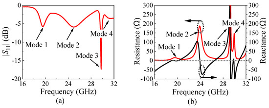 In order to clarify the operating mechanism of the proposed antenna, Ant. I with a basic SIDR is given first, as shown in Figure 2, where the basic SIDR just includes stacked substrates and the metallic cavity and is excited by the T-shaped line coupled dual slots. The size of the air gap between Substrates 1 and 2 is 0.034 mm. Ant. I could achieve four resonant points in the operating band, as indicated by the |S11| curve in Figure 3a and the input impedance curves in Figure 3b. The four resonant points correspond to mode 1, mode 2, mode 3, and mode 4, respectively. The electric fields (E-fields) of the four modes are shown in Figure 4.
