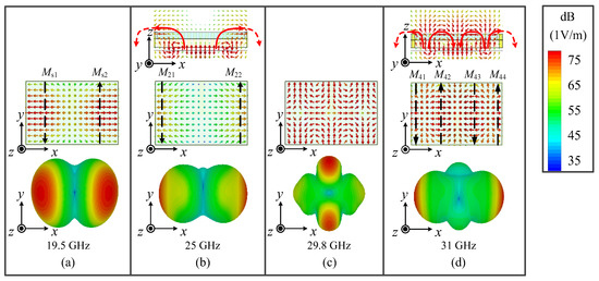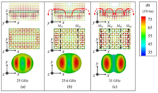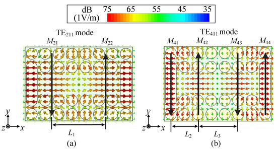 Figure 9 depicts the simulated E-fields and the equivalent magnetic current model of the proposed antenna for the TE211 mode and the TE411 mode. From the E-fields distribution in Figure 9, the TE211 mode and the TE411 mode can support stable symmetrical dual-beam radiation. The symmetrical dual-beam radiation characteristics of the TE211 mode and the TE411 mode in the proposed antenna can also be theoretically estimated. The TE211 mode can be viewed as a two-element magnetic current array, with two magnetic currents expressed as M21 and M22, separated by a distance of L1. The TE411 mode can be viewed as a four-element magnetic currents array, with four magnetic currents expressed as M41, M42, M43, and M44, while the distances between the two elements are expressed as L2 and L3. If considering that the far field radiated by magnetic current Mn can be expressed as En, the two-element magnetic current array (the TE211 mode) can be expressed as
