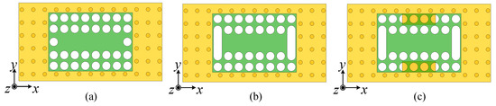 In summary, Ant. I achieves dual-beam radiation for the dual-slot mode, but it has some problems to be addressed, such as removing the unwanted mode (mode 3), the radiation direction of mode 2 and mode 4, and the poor impedance matching. Despite this, the resonant frequencies of the modes of SIDR (the TE211 mode and the TE411 mode) can be expressed in the formula. Considering the equivalent electric wall formed by the metallic vias, the number of half waves along the x-direction should subtract one because the one-half wave near the two edges of SIDR is reduced to one-quarter wave [27], so that the resonant frequencies of the two modes can be calculated by