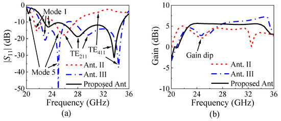 Ant. III introduces a pair of air slots along the y-direction in Substrate 1 based on Ant. II, as shown in Figure 5b. From the blue curve of |S11| in Figure 6a, it is evident that Ant. III exhibits good impedance matching in the entire operating band. The four reflection zeros, corresponding to the dual-slot mode, mode 5, the TE211 mode, and the TE411 mode, are clearly visible. Figure 8a compares the input impedances of Ant. II and Ant. III in the Smith chart, finding that the curve of Ant. III is closer to the matching point and the impedance near the TE411 mode is the most improved. In additional, due to the reduced permittivity near the air slots, the TE211 mode moves faster than the TE411 mode, and they both move faster than the dual-slot mode, broadening the bandwidth of the antenna to some extent. However, the gain dip caused by mode 5 still exists near 25 GHz, as shown in the blue curve in Figure 6b.