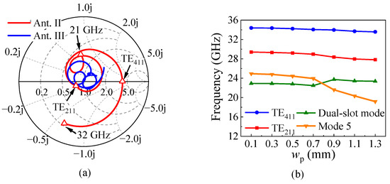 (a) The input impedances of Ant. II and Ant. III in the Smith chart. (b) The simulated frequency variation in different modes in wp.