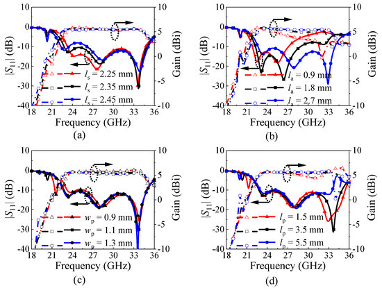 Figure 10 shows the |S11| and gain variations of the proposed antenna with different ls, la, wp, and lp. Figure 10a exhibits that the length (ls) of the dual-slot mainly affects the frequency of the first reflection zero. As ls increases, the frequency of the first reflection zero decreases, while the TE211 mode and the TE411 mode just slightly move. This is in accordance with the variation trend of the dual-slot mode, which also confirms that mode 1 is the dual-slot mode.