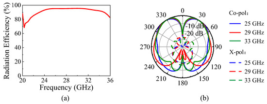 The simulated |S11| and the realized gain of the proposed antenna element are shown as the black curves in Figure 6. The 10 dB impedance matching bandwidth is 42.2% (22.75–35 GHz). The gain curve is flat in the operating band, and the peak gain is 5.7 dBi. Figure 11a shows the simulated radiation efficiency of the proposed antenna element, which indicates the simulated peak radiation efficiency is 95.5%. Figure 11b exhibits the simulated E-plane radiation patterns at 25 GHz, 29 GHz, and 33 GHz. The proposed dual-beam SIDRA has stable dual-beam radiation patterns in the E-plane with the maximum radiation at ±36°, ±31°, and ±30°, respectively. Their cross-polarization levels within the 3 dB beamwidth are all below −26 dB.