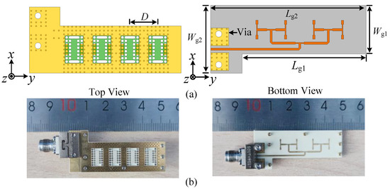 Based on the proposed dual-beam SIDRA element, a 1 × 4 antenna array is demonstrated. The configuration of the 1 × 4 antenna array is shown in Figure 12a. The dimensions of the antenna array are shown as follows: Lg1 = 39 mm, Wg1 = 15 mm, Lg2 = 49 mm, Wg2 = 21 mm, and D = 9 mm. The bottom layer is the one-to-four way feeding network. The end-launch connector is placed in the non-polarized direction of the antenna array to minimize its impact on the radiation performance of the antenna array during testing. The outline of the entire antenna array is a L-shaped structure, maintaining symmetry of the main radiation body in the x-direction when adding the end-launch.