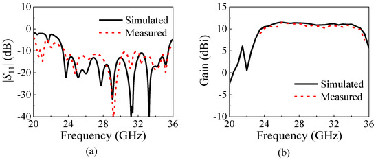The simulated and measured |S11| of the proposed 1 × 4 antenna array are shown in Figure 13a. It can be found that the measured results of the antenna array agree well with the simulated ones, and the antenna array achieves a wide 10 dB bandwidth of 41.2% (23.36–35.47 GHz), which has a slight difference in frequency and bandwidth compared with the antenna element due to the existence of the feeding network. Figure 13b exhibits the simulated and measured gain of the proposed 1 × 4 antenna array. The measured gain curve is still flat and has a peak gain of 11.54 dBi. The measured gain curve is slightly lower than the simulated one due to the testing errors.