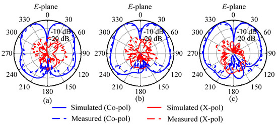 Figure 14 shows the simulated and measured E-plane radiation patterns of the proposed 1 × 4 antenna array at 25 GHz, 29 GHz, and 33 GHz, which show that the simulated radiation patterns agree well with the measured patterns. In the E-plane, the dual-beam radiation patterns have maximum radiation at ±35°, ±30°, and ±32°, respectively. The two beams of the E-plane radiation pattern are nearly symmetrical, with almost the same gain. The measured cross-polarization levels within the 3 dB beamwidth are all below −17 dB.