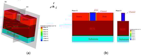 The 14 nm SOI FinFET device structure: (a) 3D schematic of SOI FinFET; (b) cross-sections of SOI FinFET.