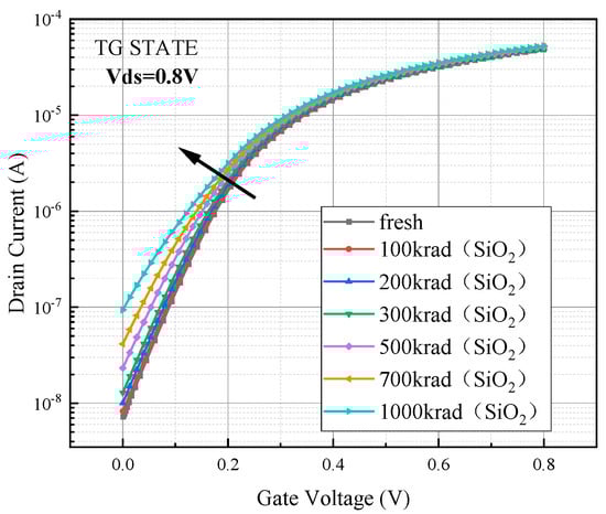 Based on the above device model, the degradation of the electrical parameters of the device during irradiation was simulated. During the simulation process, the device was in TG bias state (Vs = Vd = 0.8 V, Vg = 0 V), the simulation temperature was set to 300 K, the irradiation dose rate was 1 krad (SiO2)/s, and the irradiation doses were 100 krad (SiO2), 200 krad (SiO2), 300 krad (SiO2), 500 krad (SiO2), 700 krad (SiO2), and 1000 krad (SiO2). While electronic devices are commonly subjected to long-term irradiation conditions in many practical applications at low dose rates, typically ranging from a few hundred rad (SiO2)/s to a few rad (SiO2)/s, the use of a higher dose rate of 1 krad (SiO2)/s in this thesis expedites the observation of irradiation effects. This also expedites the research process by acquiring the potential impacts of long-term radiation on a material or technology in a shorter amount of time. Furthermore, high dose rates can also mimic how devices might function in harsh environments, such as space habitats or specific applications where they may be subjected to high dose rate irradiation conditions. The device transfer characteristic curves were extracted after the irradiation simulation was completed, Vds was set to 0.8 V, and the gate voltage was scanned from zero to 0.8 V. The degradation of the transfer characteristic curves shown in Figure 3 was obtained.