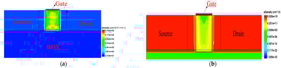 Figure 4 and Figure 5 shows the electron density and mobility at the bottom of the channel at different radiation doses. As can be seen from Figure 4b, the higher the irradiation dose, the higher the concentration of positively charged trap charge in the buried oxygen layer; furthermore, the higher the concentration of converged electrons at the bottom of the channel, the greater the impact on the threshold voltage and off-state current. At the same time, as the collision probability between the carrier and the Si/SiO2 interface increases, the mobility of the electron surface decreases correspondingly.