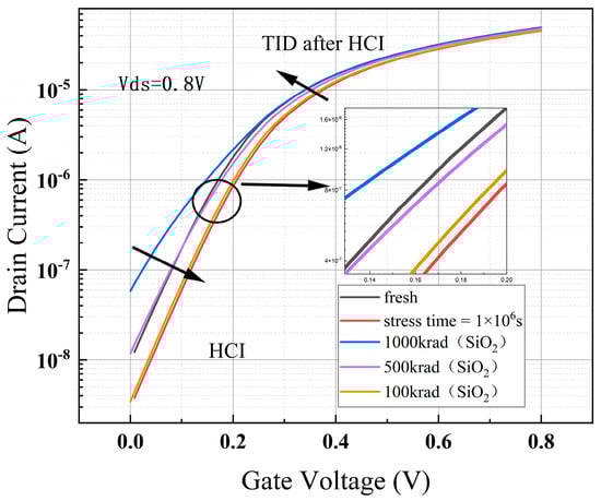 The hot carrier effect was first simulated under the stress condition of 1.2 V applied to the gate–drain and the source–substrate ground for 106 s. After that, the device was put in the transport state to simulate the total dose effect at an irradiation dose rate of 1 krad/s, and the simulation times were set to 100 s (100 krad (SiO2)), 500 s (500 krad (SiO2)), and 1000 s (1000 krad (SiO2)). After the simulation, the drain voltage was fixed at 0.8 V, the source and the substrate were grounded, and the gate voltage was swept from 0 to 0.8 V in the output transfer characteristic curve.