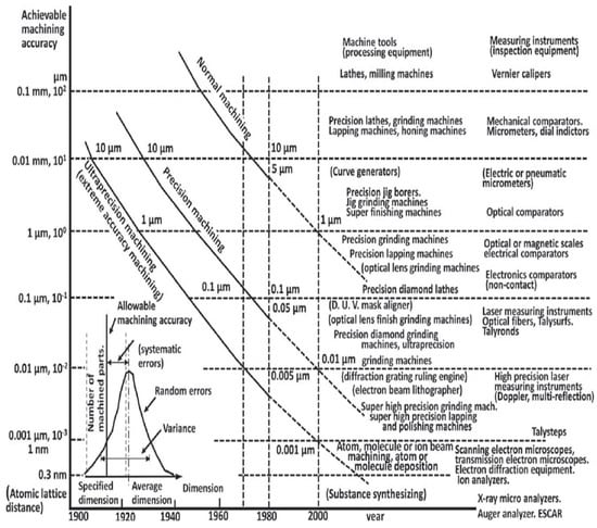 From the 1960s–1970s, the technology of ICs was initially and mainly of interest to the military. Nowadays, the technology of ICs is needed in nearly every discipline: telecommunication, medicine, instrumentation and automation, aerospace and aeronautics, computing, modelling and simulation, and so on [,]. Likewise, ultraprecision machining was initially designed for metal optics machining with a focus on the energy and defence needs in 1960 []. However, the accelerated development of the technology for this machining technique in terms of improved machine design, improved cutting tool design, non-contact drive systems, and computer numeral control (CNC), particularly in the USA, European countries like the United Kingdom and Germany, and Asian countries like Japan and China has led to various applications: X-ray telescope mirrors, infrared reflective optics, annular resonator optics, automotive illumination systems, security and safety, renewable energy generation, and environmental monitoring [,,,]. With this technology, more components used for MEMS and NEMS devices are developed at a competitive price. It has been claimed that Taniguchi’s chart (Figure 2) is similar to Moore’s law [] because the main aim of ICs is miniaturisation []. How long ultraprecision machining follows suit with Moore’s law is a question that will be left to the researchers in the discipline to answer.