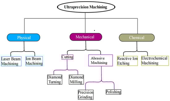 Yang et al. [] classify ultraprecision machining processes based on the material removal process’s physical nature as mechanical, physical, and chemical (Figure 3). Although each classification has its specific area of applications, mechanical ultraprecision machining is universally versatile with a long tradition, since a series of surface structures such as flat, spherical, aspherical, freeform, etc., can be generated in addition to a large class of engineering materials that can be processed [,].
