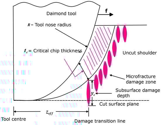 where is critical chip thickness, is the feed rate, is the distance from the tool centre to the ductile-to-brittle transition line, and R is the nose radius of the tool. The research effort of Blake and Scattergood [] was complemented by Blackley and Scattergood [] who put forward a modified model by introducing a new parameter, , known as subsurface damage depth. This parameter symbolises the depth of the average fracture propagation. This model is represented by Equation (2), and its geometrical machining model is schematically displayed in Figure 4.